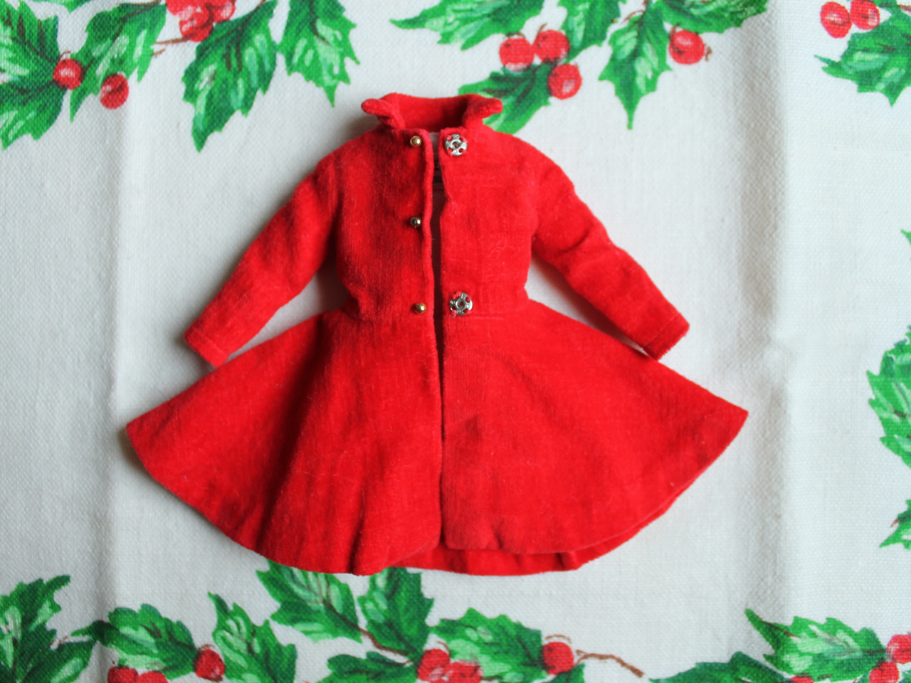 So, for a few months now, I've been spending time on ebay admiring the beautiful (and quite expensive) old dolls and clothing. One item I kept my eye out for was this red velvet coat for Skipper. The coat originally came with a hat, purse, gloves, socks and shoes, but all I "needed" was the coat. I eventually found it for $15 Cdn, including shipping, which might seem like a lot to pay for something like that, but, trust me, I'm a frugal shopper and that was a very good price for the tiny garment made in 1963, which still included all of it's original buttons and snaps. So, while I didn't spend a dime on clothing for myself to wear over the holidays, Skipper got a new/old coat!