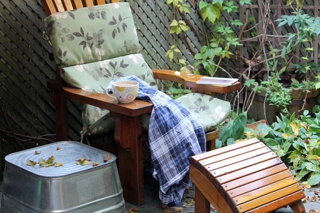 There's no doubt that I will miss sitting in this chair outside once the weather turns. By the look of the weather today, my sessions out there are numbered for this year. But you never know because a couple of days last week we had gorgeous sunny weather with temperatures in the upper 20s.These pictures were taken last Sunday. There was nothing on my agenda in the afternoon so I made myself a nice cup of Cafe au Lait, and brought it and my