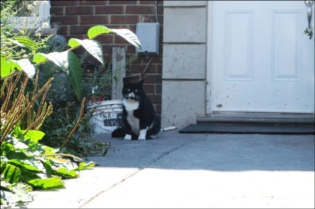 I spotted this cute cat sitting in front of the door of a different house, a couple of buildings down from where I took these pictures. When I saw her I went for my camera that was in my bag, and of course she got wise and hit the road running away. So I followed her.
