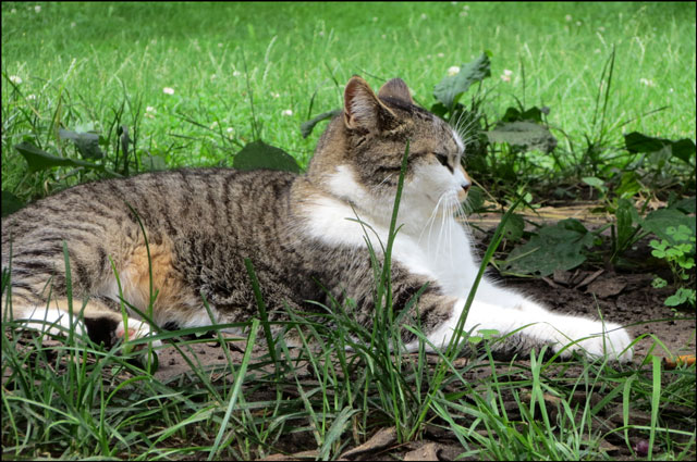 Here is the .01% exception to that rule. This little lady was sitting under a table in the shade when I spotted her. Having learned my lesson upon reviewing far too many pictures of a cat's behind as they fled the scene, I crouched to take a shot from a safe distance away. Well, this girl would have none of that keep-your-distance stuff. She jumped up and came right on over for a bit of petting and chatting. In fact, I had to keep moving away from her to get a decent shot, as she just kept right on getting very close to me.