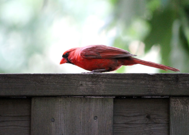 I thought I might be wrong about them being gone, when on Saturday I was reading outside on the deck. I heard a fancy bird call and jumped up all eager-like to see what I hoped was one of them. Stretching on the tip of my toes to see over the fence, I looked towards the sound. There was a lady, about 40, dressed in hospital scrubs, on her bike and obviously on her way home from work. She had stopped in the road and was whistling a most impressive bird song towards a group of sparrows that live at the top of a light post. She had left some food for them and was encouraging them to come and get it. She actually called out ‘Come and get your dinner’ to them a few times before riding away. She never saw me seeing her. That was pretty interesting to catch sight of, but kind of sad because it wasn’t ‘my’ Cardinals.