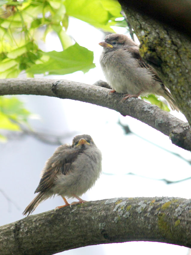 It doesn’t take long for sparrows to take on the appearance of adult birds though, and soon we couldn’t tell which was which. Well, except for the father, because, even as I type this now, he is out there chirping up a storm announcing to all who will listen, that he has found an excellent spot to build a nest! I’m not sure how many broods sparrows have per season but we might have some more stovepipe interlopers unless we get cracking on that minor home repair!