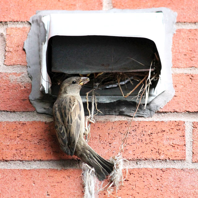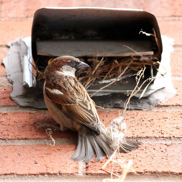 Evidently it is time for us to have the vent that leads from the stove exhaust fan to the outside of our home replaced, because a clever male sparrow figured out how to lift the metal flap and went ahead and built a nest in the opening for his family.