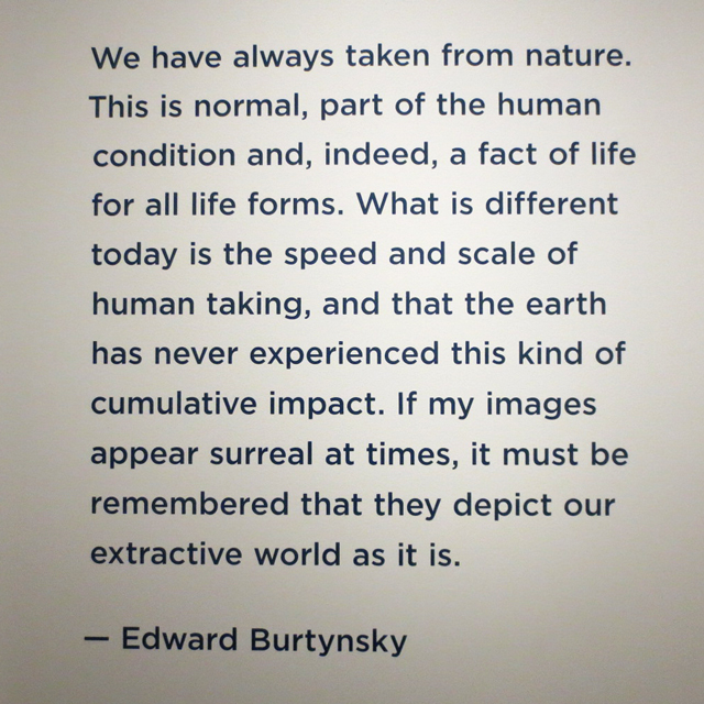 Some key words in the artists’ opening quote is that their intention is to inform and reveal and is “not accusatory”. Amoungst the written observations and facts given at the base of each piece, is the statement that the sites represent jobs and livelihoods. They’re not saying that we don’t need the lithium batteries that we use so much today, but they’d like us to note the effect that making them has on the planet. As is summarized at the end of the exhibit, there is no question that global warming is real.