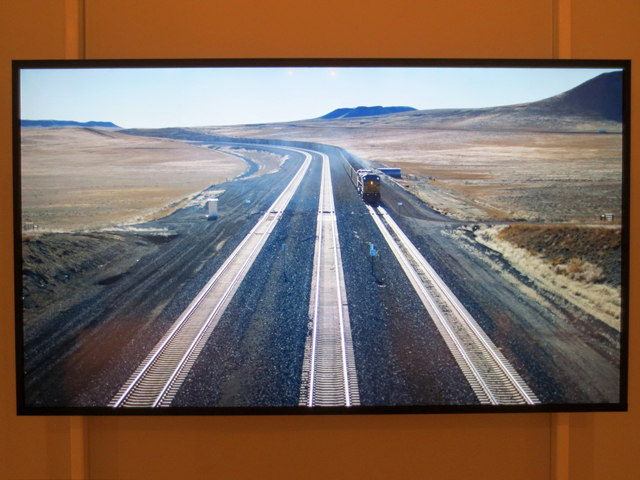 ↑ Some of the pieces, interspersed amoung the photographs, are short film loops — this is a still of one of a train carrying coal in the state of Wyoming. ↑