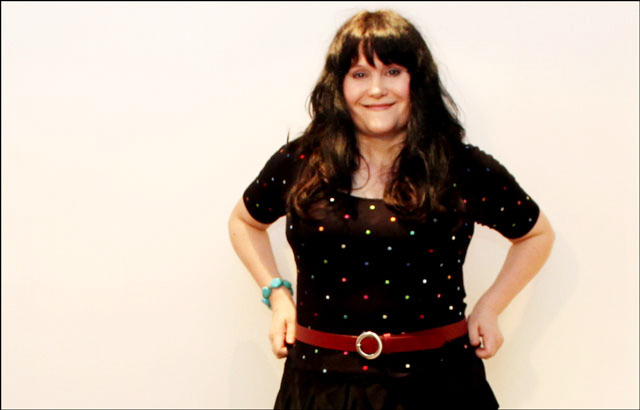 I decided to go with this sheer polka-dotted shirt, pairing it with a short black skirt, tank-top, and leggings. I glammed things up a bit with a big red cocktail ring and a colourful necklace. Also worn is an elastic belt (that I made and posted about here) but you can barely see it in the photos.