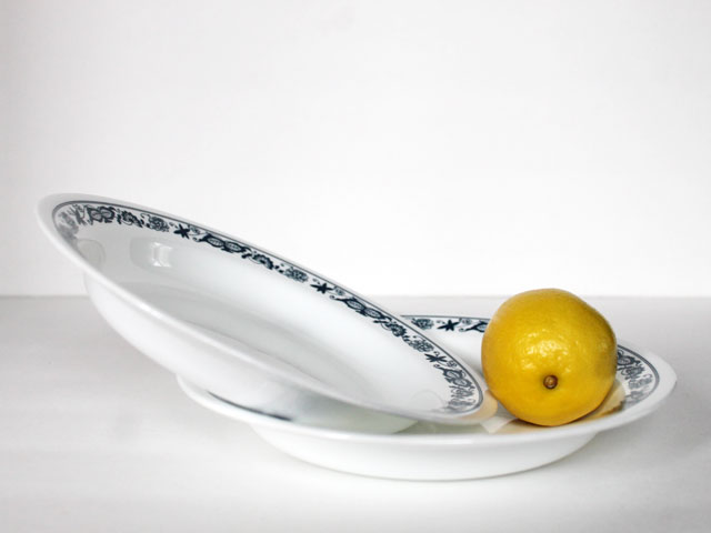 This next find had me doing a little dance of joy in my head when I saw them — 2 vintage Corelle Soup Plates, in the pattern Old Town Blue, that appear to never have been used. This pattern, which I’ve been collecting for the past five years or so, was discontinued in the 70s, so these are about 40 years old. What made me especially happy to find these is that the shape is rare, and there aren’t many in circulation. They’re made for soup, but we’ll also be using them for salads, pasta and desserts.