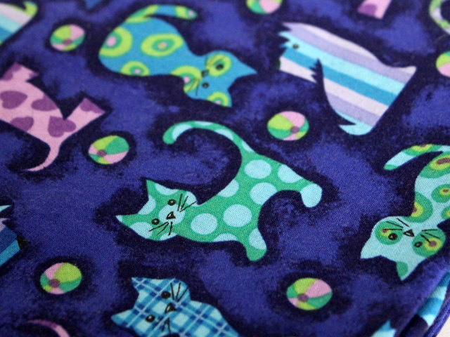 ↑ The other is this handmade pillow case, made from high quality, adorably printed, quilting cotton. I actually got it for the fabric, which appears to have been washed no more than a couple of times at most, and will probably be taking it apart to make something else. Or not — I’m not sure yet. I know a certain feline who might like it to cover his mattress, which is actually just a regular bed pillow, popped into a clean litter-tray, somewhat like the set up seen in this post.