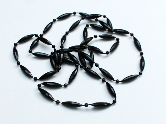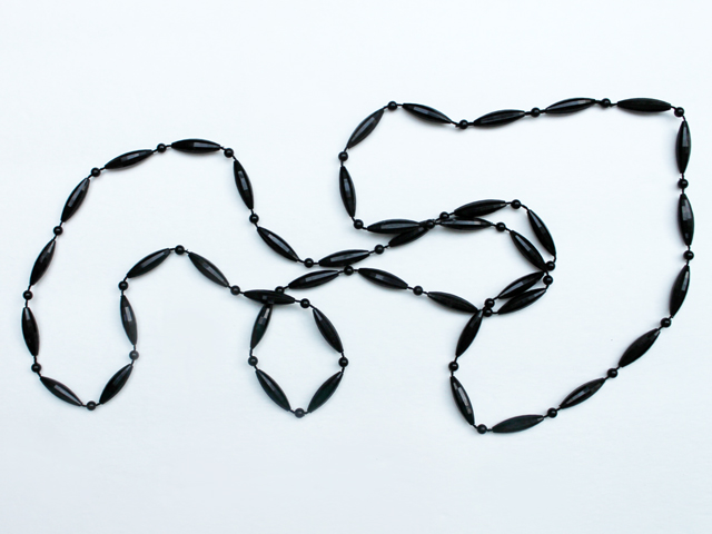 This type of necklace would have been a low-cost option back in the 50s and 60s. I actually prefer them to the “real” thing (such as this jet one I thrifted a couple of years ago) because the beads are attached to the cord so there is no worry about breaking one and having the beads go all over the place, which is something that certainly can happen with long necklaces like this, especially vintage ones with old fragile cords.