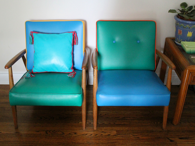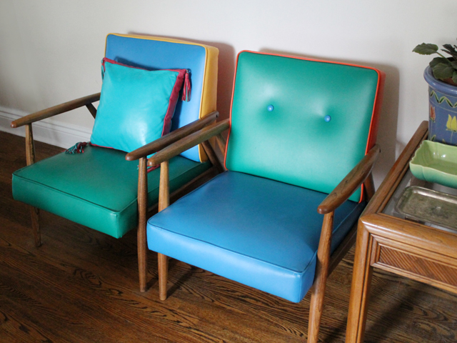 About these chairs — I bought them from a friend of a friend who had hired me to dj his studio opening party. His business was refurbishing vintage furniture. While I was at the party I spotted these chairs in his work area. The vintage hardwood frames were solid (and a brand I should know but forget). The coloured thick vinyl was also vintage, remnants from an old factory. They didn’t have enough of one colour to redo a whole chair so they mixed up the colours. I absolutely loved them and bought them on the spot, using the proceeds of a win from the slot machines at the casino. I had gone to Casino Rama on a lark the week before with my mom, and not only did I win one big prize, but I won twice that day. I had enough to share a bit of fun money with my family and to get these chairs. That was fourteen years ago and I haven’t been back to the casino since but remembering that fun time makes me think I should go.