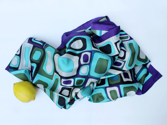 My fingers found this next item before my eyes did. This large square scarf, with hand bound edges is made of silk that is thick and lush. It appears never to have been used, purhaps because the greens and purple didn’t appeal to the owner, or the mod look was not their style. That’s ok, because it is mine. Here in Toronto it gets so cold in the winter that I often wear two scarves, a soft silk one wrapped close to my neck and then a woolly one over that.