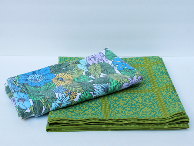 Moving over to the linens department, I was happy to find two 100% cotton vintage table cloths. They’re both square with the floral one being a small one, perfect for a little side table we use where entertaining out on the deck. Each was under $4. They’ve both been used already — you can see the green one covering our table when our friends Chops and Leslie came over recently.