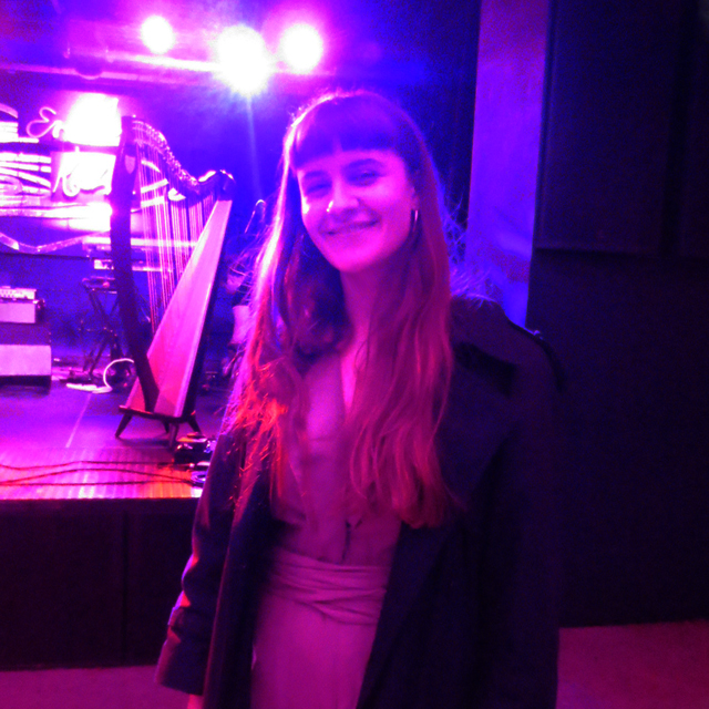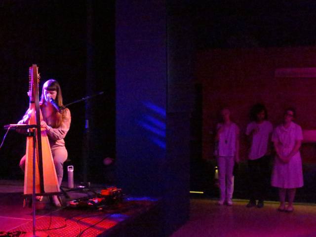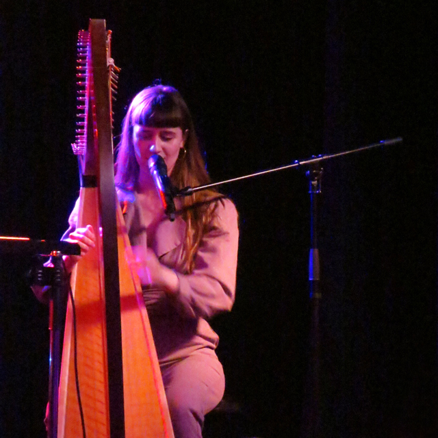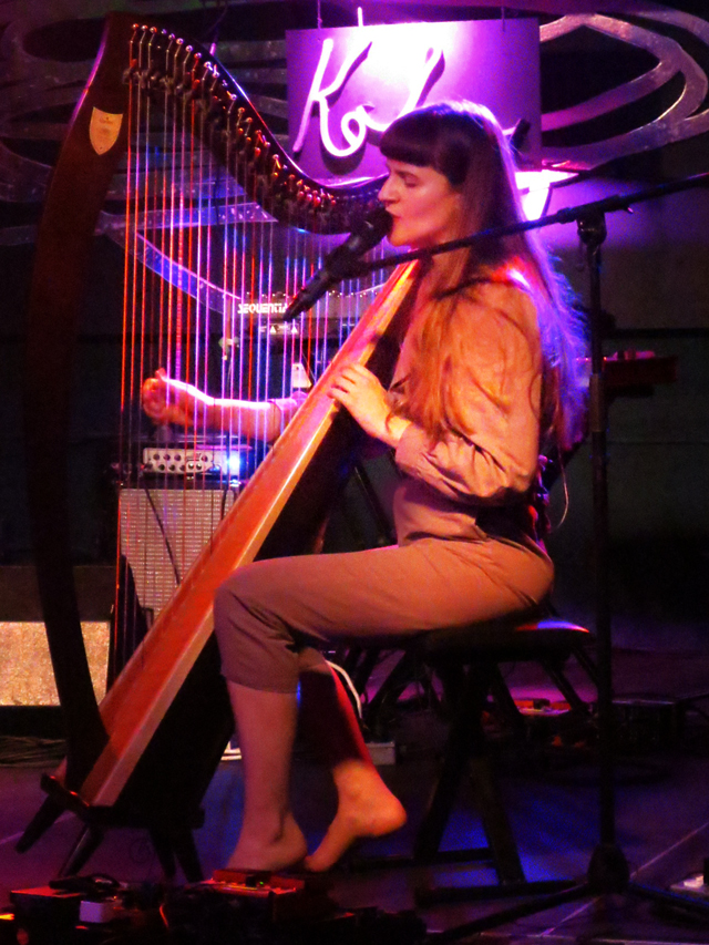↑ There she is, singing into the microphone hung inside the column of the harp, while controlling the effects/looping pedals with her feet. ↑