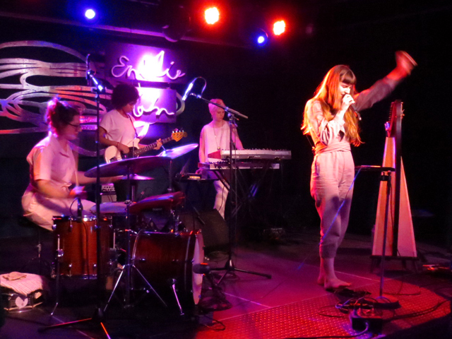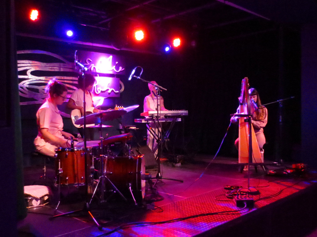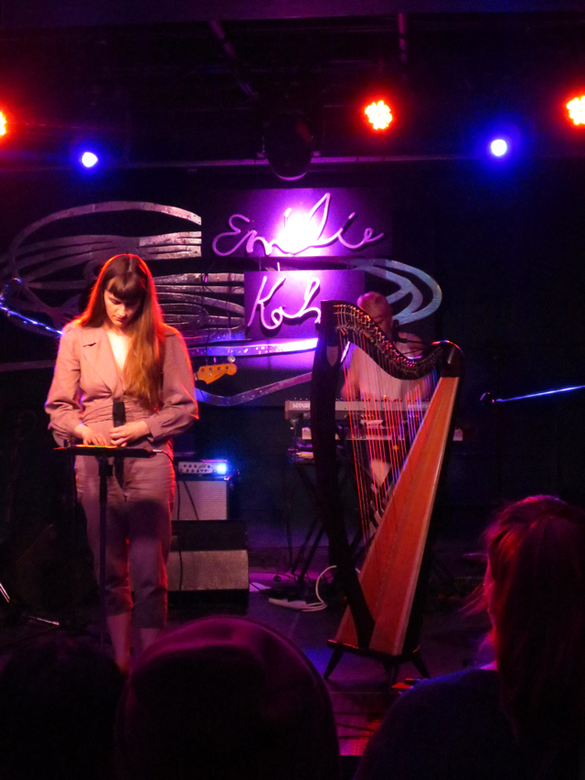 Emilie Kahn is a young songwriter, singer, and harpist from Montreal, Canada. Yes, she plays the harp. Not to be narrow-minded, but had I noted that before listening to her music, I’m not sure I would have gone ahead and checked it out, not because I don’t like the harp, but because I don’t really know it. I’d associate it with classical, new-age or folk music more than I would with the indie-rock genre that I tend to prefer. Now, after having heard Emilie perform, I’m a fan of the multi-stringed instrument, especially as she presented it, mixed with keyboards, bass guitar and drums.