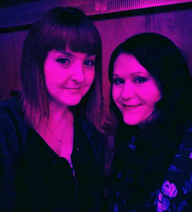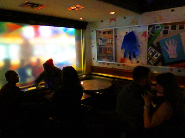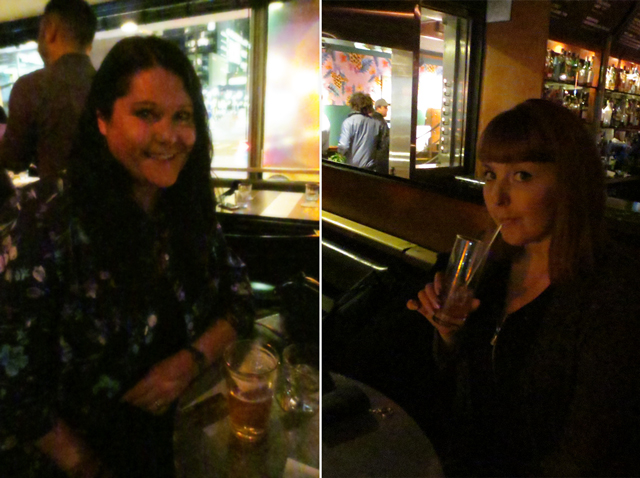 ↑ Two pals, taken by Andrea (left) with her phone. There are strips of neon along the ceiling, that cast things in a purple light. ↑