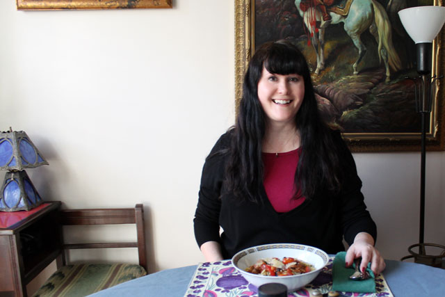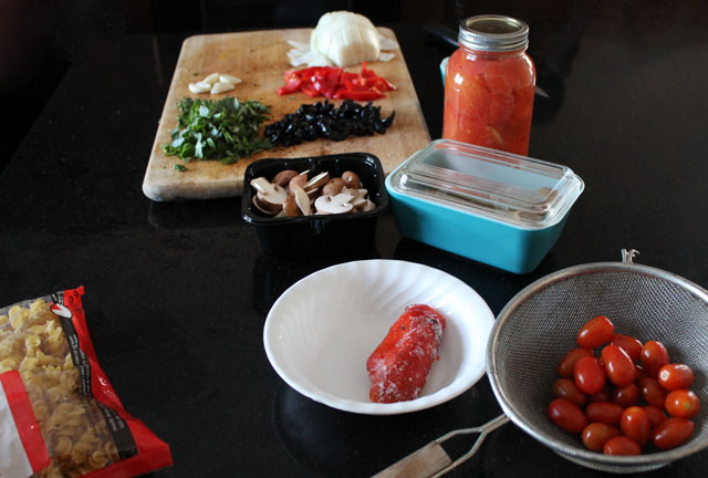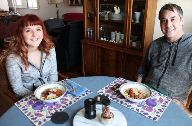 While we were busy cutting, sticking and chatting Nick partook in his hobby and cooked us up a delicious meal, which we took a break to enjoy. He made some pasta that I think was one of the best he’s ever made, using some of the grilled red pepper he made last summer and stored in the freezer (that’s what is in the white bowl and here is the post describing making it back in August.). The ingredient added such a nice smokey flavour to the sauce. So good.