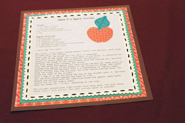 Andrea had the idea of finishing the piece off with a paper appliqué in the shape of an apple because the recipe featured apples. Cute!