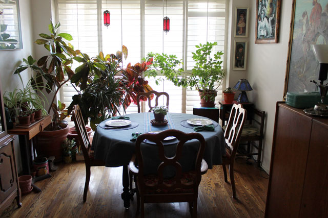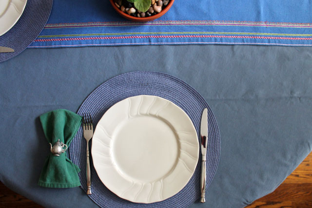 I added a hand-embroidered runner to the dining table that I found at the Thrift Store during this shopping trip. Also thrifted is the floral tablecloth in the kitchen, found during this trip.