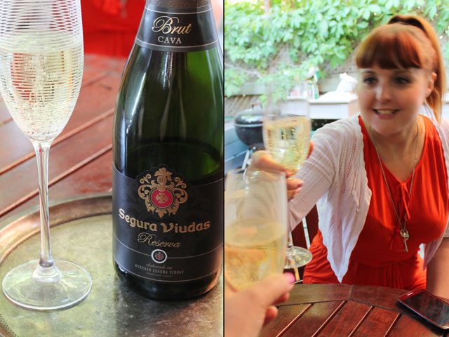 After we ate our delicious dinner, we went outside to have a celebratory glass of bubbles. Nick popped open a bottle of Spanish Segura Viudas.