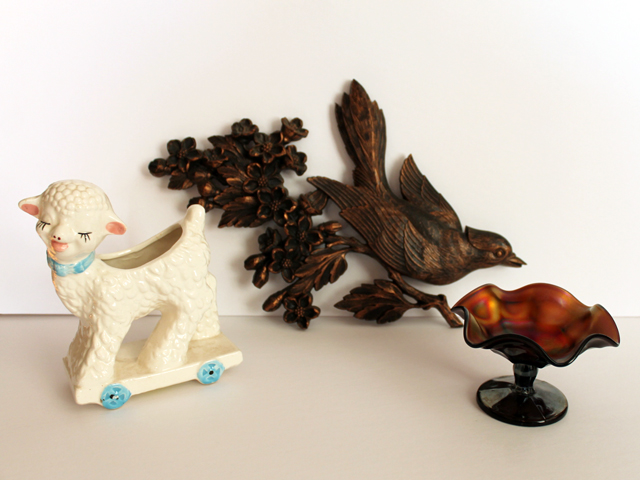 I should state that only one of the three was in perfect condition, another being completely intact but having a small hairline crack and the other having a tiny chip. They’re all in totally usable condition, though, and I pointed out the flaws to Camille but she doesn’t care. Personally, I don’t mind when vintage things are slightly flawed/used, so I don’t feel badly using them, instead of maintaining them in perfect shape, and I’m glad she feels the same way, too! I did back the cost of the less than perfect ones out of my total spend, to keep to the budget of about $10 per person. ↑