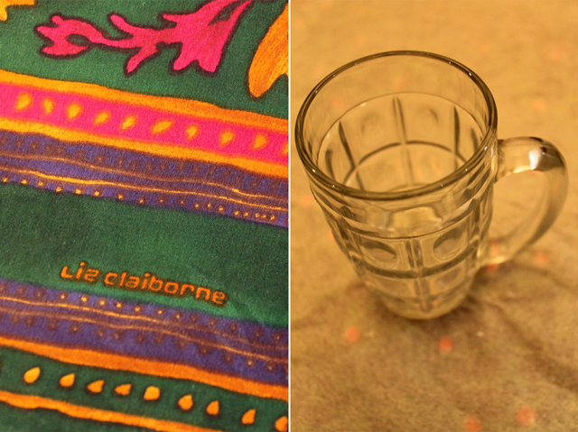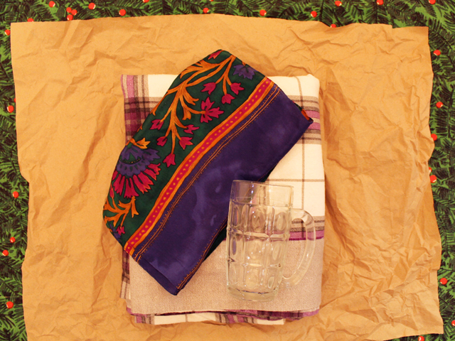 ↑ A silk scarf in her colours. In fact, it ended up going nicely with the outfit she was wearing so she wore it the whole evening. Also, a vintage pressed glass mug/stein, in perfect condition. ↑