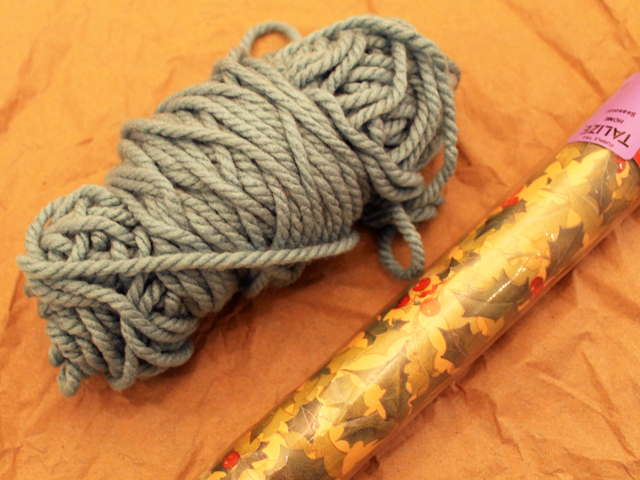 Fitting with the “nothing brand-new” notion, I wrapped the gifts using a roll of Hallmark wrapping which I’d previously found at the thrift store and some thick yarn, also thrifted.