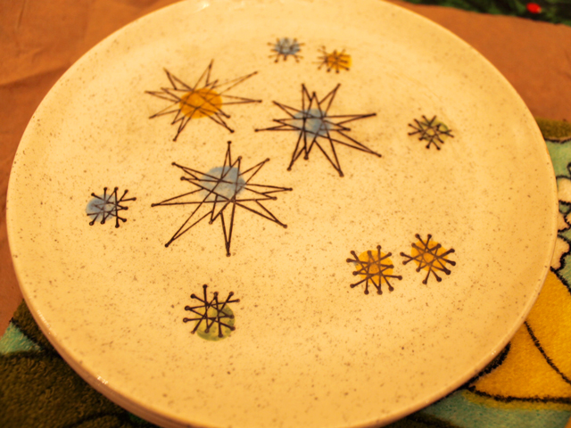 ↑ Camille uses a beautiful assortment of mismatched vintage dishes and already has a dinner plate in the same pattern as these three side plates. They are handpainted “Les Etoile” by Fransiscan, also known as “Atomic Starburst”. They’re quite collectible, but she’s going to go ahead and use them instead of saving them.