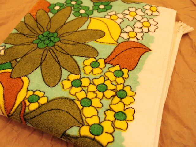 ↑ A printed cotton terrycloth towel from the 70s or so. This had never been used/washed before, so, to maintain the pristine crispness of its colours, I didn’t wash it before giving it. She was happy about that and plans to display it, rather than actually use it as a towel. ↑