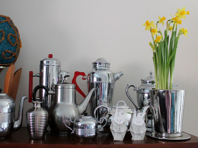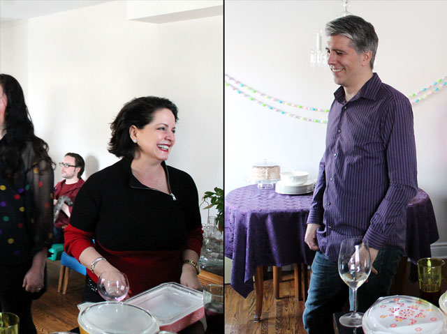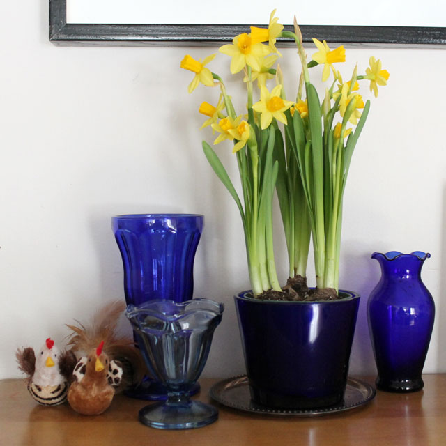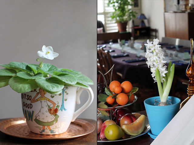 I started this hyacinth bulb, that came dry in a box, on January 31, by placing it in water a special jar that came with it, and leaving it in a dark cool place. Over the past 2 months, roots grew and then a green bit sprouted. I brought it out of the dark last week, and as luck would have it, it was in perfect flower for the party. It’s the first time I’ve tried forcing a hyacinth and I was pretty surprised that it worked so well.