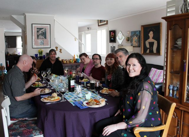 Something that Nick and I have talked about doing for a while is to host a larger dinner party. We do regularly have people over to eat but, with a few exceptions, it has always been one or two at a time. However along the lines of ‘the more the merrier’ we thought it would be fun to get a larger group together, so we made a goal to put all five leaves, that have been gathering dust under the sofa, into our dining table and gather a bunch of good people around it for a meal. That happened on the Saturday evening of the Easter weekend, when a group of ten (including us) got together.