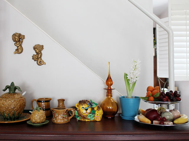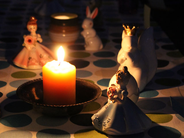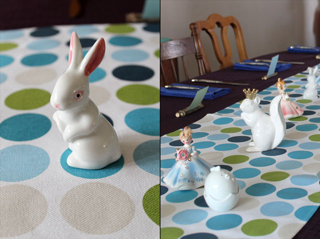 The table was decorated with an assortment of figurines, some vintage, some gifts, and some thrifted. The little chicks in a shell are salt shakers, so they served a purpose as well as looked cute.