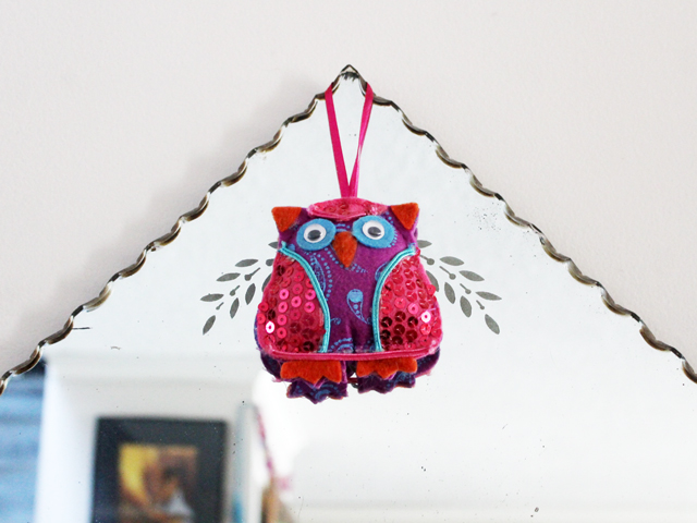 ↑ I found this little felt and sequin owl laying face down amoungst the leaves on the sidewalk several years ago. The ribbon was broken, so I assume it had previously hung on someone’s backpack or something like that. I rescued him, fixed the ribbon and re-glued a few bits, and now bring him out every autumn. ↑