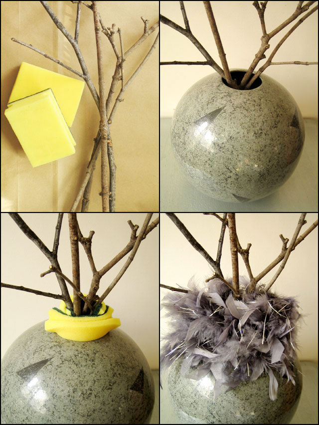 (5) Cover the sponges that protrude from the top of the vase. I used a bit of feather boa (yes, I like this stuff!), but you could use cotton wool to mimic snow, or fabric and/or ribbons.