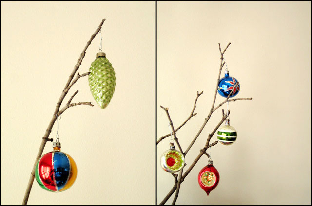 (1) Select as many branches as you want to use, but no more than four. Try to pick ones with lots of little off-shoot branches from them. Even one branch with one or two ornaments hanging would make a nice table display.
