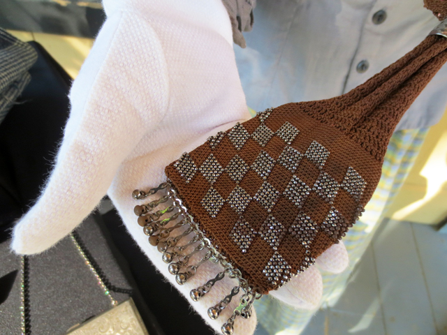↑ This is called a “Miser’s Purse” because it was so difficult to get the coins in and out of! There’s a slit in the top to put the money in and a ring that pulled up and down to close the purse. It was worn by women, draped over the waistband of their skirt. ↑