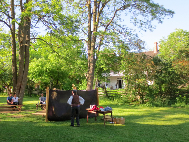 The building seen in the photo on the left is Burwick House, 1844, moved from Woodbridge. The one you can barely see in the photo on the right is the one room school house, Dickson’s Hill School, from Markham, 1861. ↑