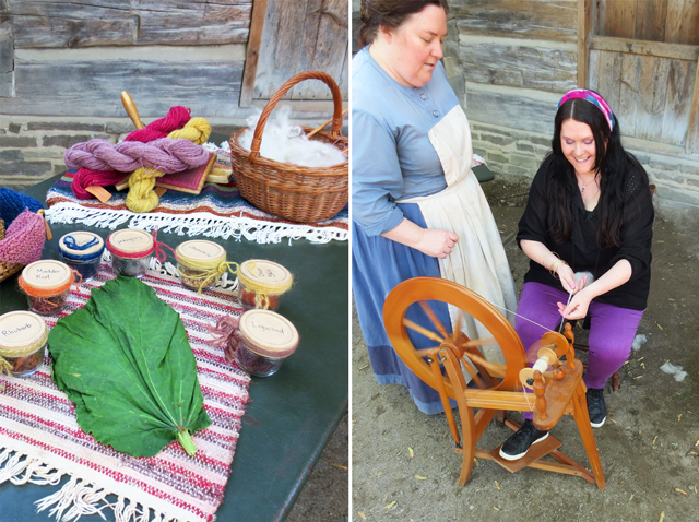 ↑ I’ve always wanted to try spinning wool into yarn, and I finally got my chance that evening. You have to keep the wheel turning by pumping the pedal, all while feeding the wool, a bit at a time. It takes a lot of coordination, for sure. We were told that it took a woman a whole day to spin enough yarn to knit one pair of socks. On the left is a display about dying wool using natural ingredients like Rhubarb and Onion Skin. ↑