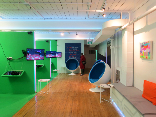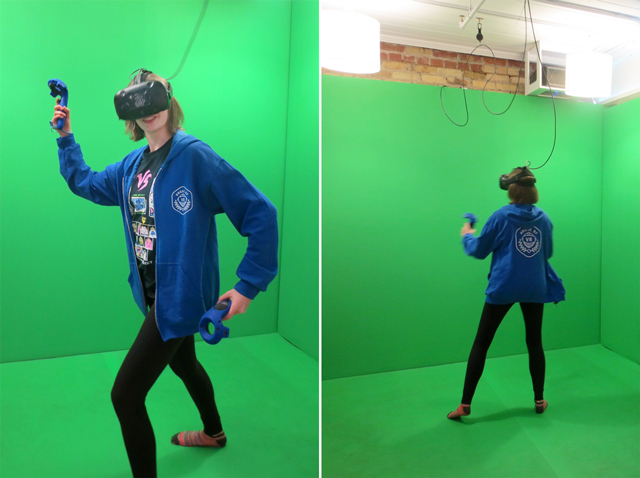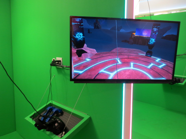 ↑ The green screens allow your friends to watch what you’re doing, while “inside” the experience of your choice. ↑