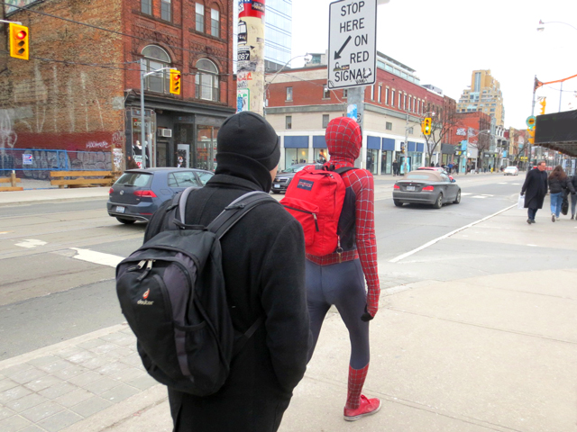 ↑ Coincidentally, given the longstanding comic book connection to the spot I was taking the photograph from, Toronto’s own Spiderman Peter Parkour happened to be walking by!