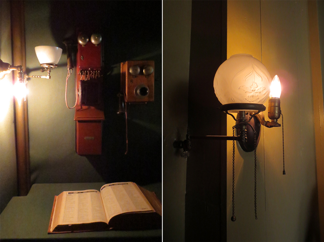 ↑ While we’re on the subject of new technology, the telephone had its own little cubby booth, located in the hallway. Many of the lamps were set up to be powered by both gas and electricity. ↑