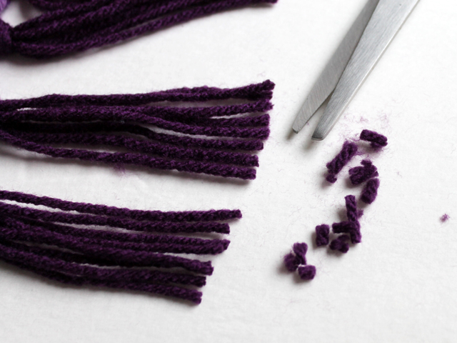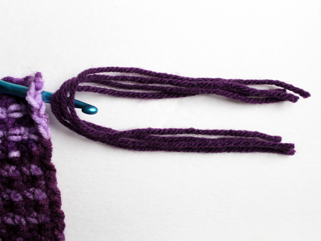 ↑ Cut 4 x 10 inch pieces of yarn in a complimentary solid coloured yarn, for each bundle. I went with 7 bundles, equally spaced over the 6 1/4 inches, so that’s 28 pieces of yarn. (I used Bernat Super Value yarn, which is a medium weight Acrylic, in the colour “Mulberry”. It’s the same yarn I used to make the matching hat, detailed below.) ↑