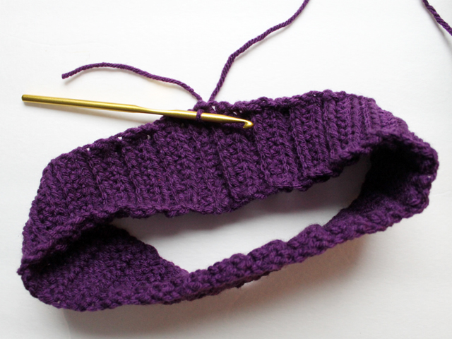 ↑ Then, attach a new section of yarn and single-crochet along one edge of the ribbed ring, three stitches per repeat in the ribs. (mine turned out with 72 single stitches, but a couple more or less won’t make much difference.) ↑