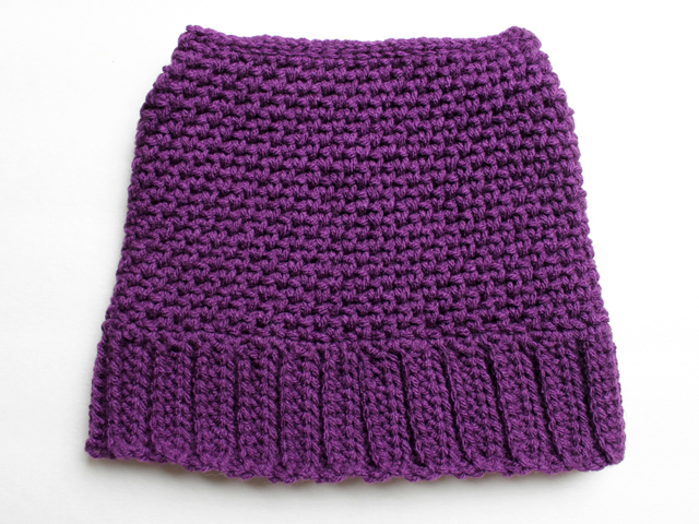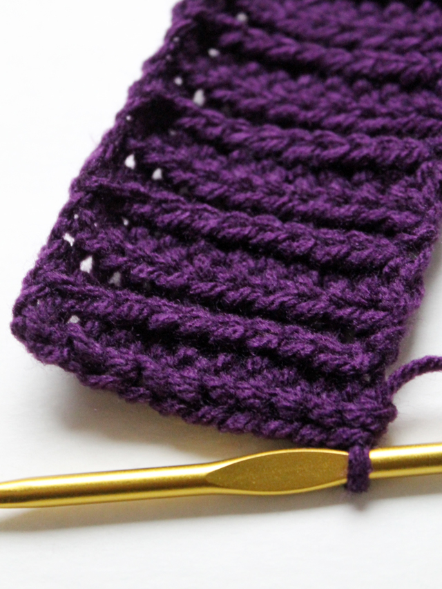 For mine, the ribbed section is begun with a chain of 12 (10 plus 2 for turning). Then, using half-double-crochet stitches, you go back and fourth, stitching into the back-middle loops of the stitches in the previous row. There will be an obvious front and back-side to your piece.
