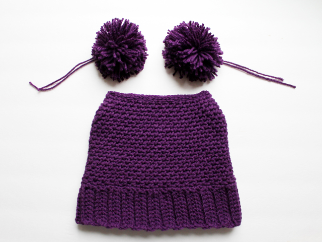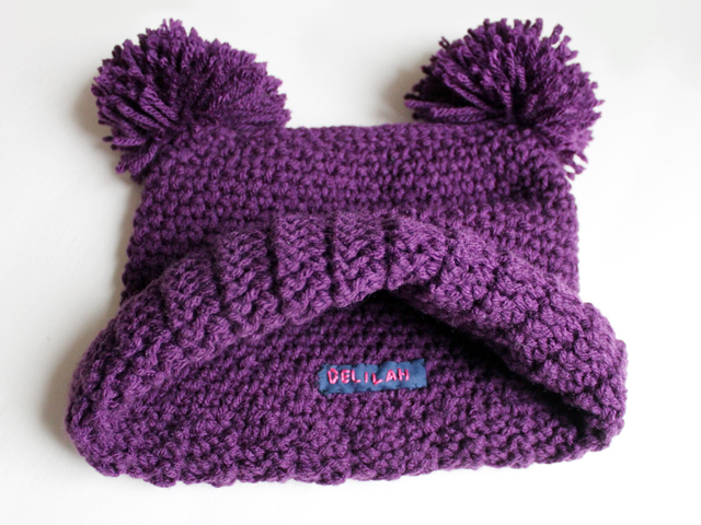 As you can see from the photos, the hat a squarish shape adorned with two pompom “ears”. There is a 2 1/2 inch ribbed band around the opening, which is a bit stretchy, and which allows for the hat to be worn with the brim turned up or left down. I’m thinking that will mean that it will fit Delilah for a few years, as she can wear it with the brim up now and down when she gets bigger.