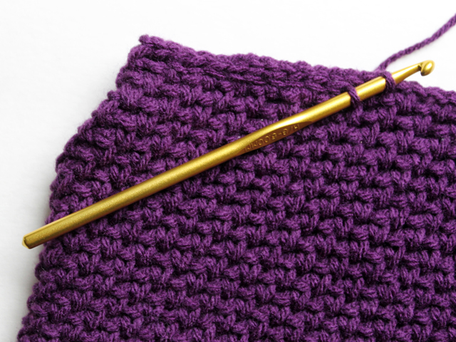 ↑ Again, using the hook to help, create a single knot close to the edge of the scarf. ↑