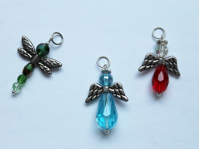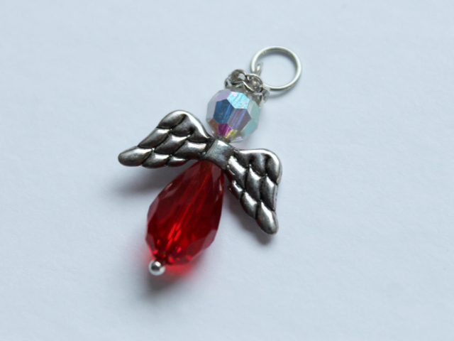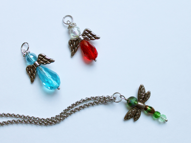 These are a pretty easy beading project, as you can purchase the beads you need altogether, as pictured below. I got these at Michael’s. Then you only need to add the findings and a chain. (Note : for the red and crystal angel, with the sparkly halo, I used beads and other pieces I had in my stash.)