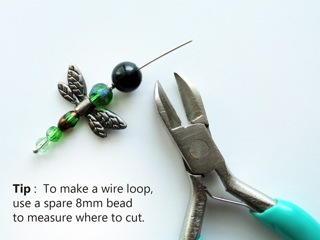 ↑ I’ve found that 8mm of extra wire allows you to make a nicely sized and shaped loop, so I use a spare 8mm bead to quickly measure. ↑