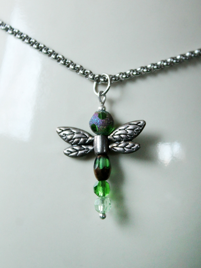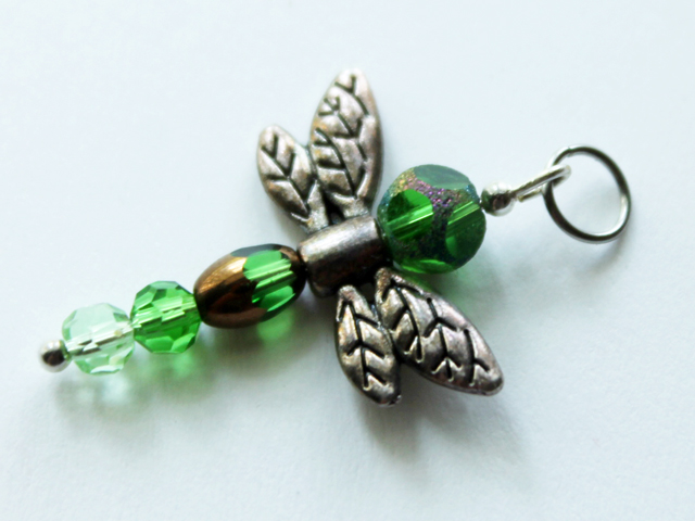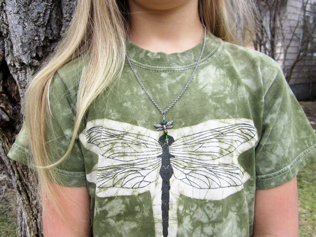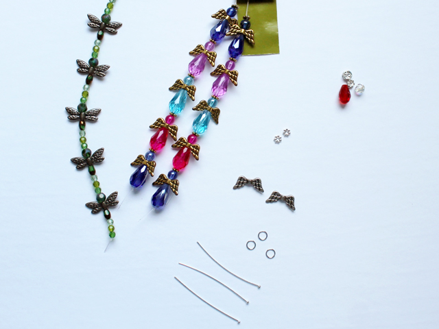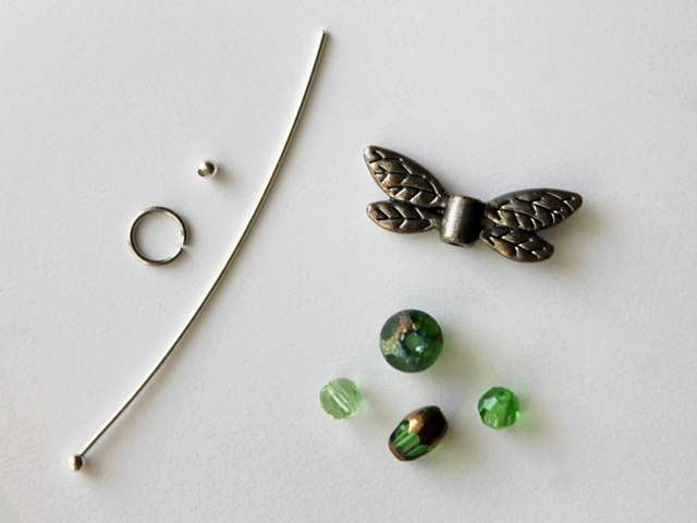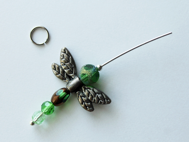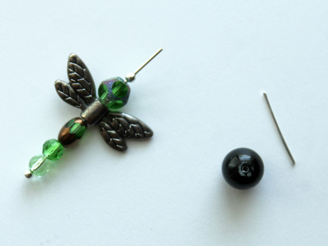 - To make a Dragonfly Pendant you need the beads from the pre-assembled string, plus a long ball head pin, a small bead to match the head on the pin, and a jump-ring large enough for your chain to go through. (Note, I made the pendant a bit more kid-sized by only using two of the three round beads provided.)