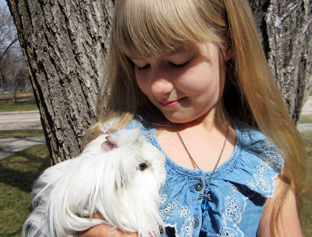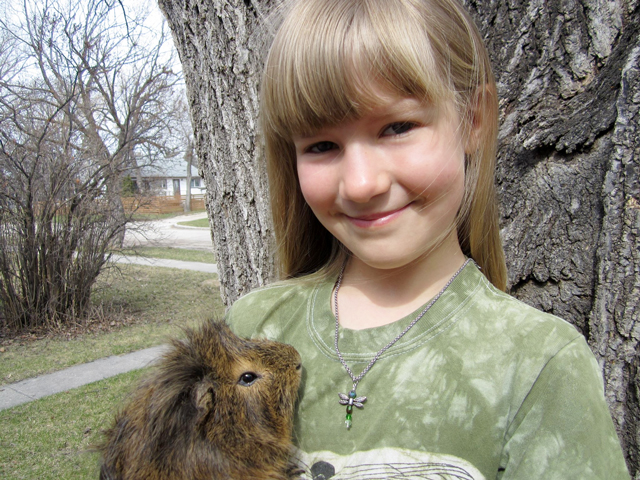 This past Christmas, I sent her three beaded pendants and a chain to wear them on. At the end of the post, I’ll demonstrate how they were made, but first, let’s look at them being modeled by this darling person (and her beautiful Guinea Pigs).