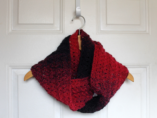 crocheted-cowl-scarf-made-with-one-skein-lion-brand-scarfie-yarn-cranberry-black-free-pattern